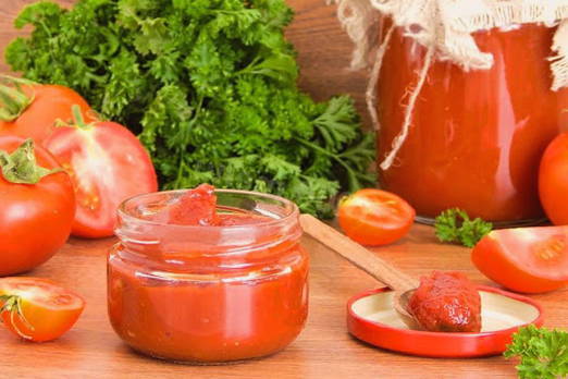 - Doe de tomaten, gehakt met een blender of in een vleesmolen, in een pan, breng op smaak met gehakte kruiden, specerijen en kruiden, verwarm gedurende 7-10 minuten en giet dan de resulterende tomatenmassa in een groentesaus. Kook nog ongeveer 40 minuten, terwijl je meerdere keren roert.
