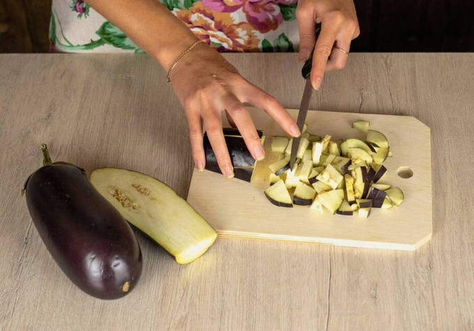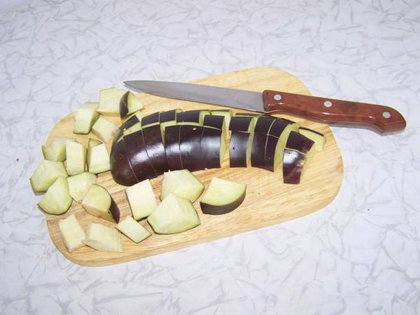- Snijd de aubergines, gewassen en gedroogd, in grote blokjes.