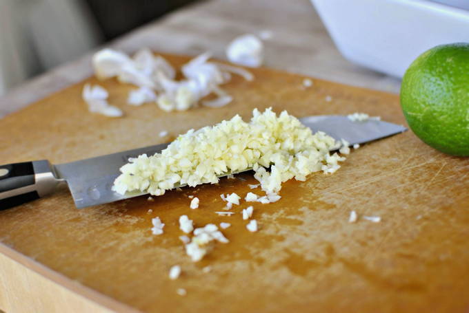 - Verwijder de zaadjes van de hete peper zodat het werkstuk niet te heet wordt en hak het dan heel fijn. Pers de knoflook, ga door een pers, of snijd in kleine stukjes.