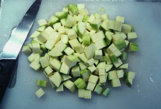 - Jonge courgettes kunnen samen met de schil in kleine blokjes worden gesneden en ook worden gebakken, en vervolgens worden overgebracht naar de aubergine.