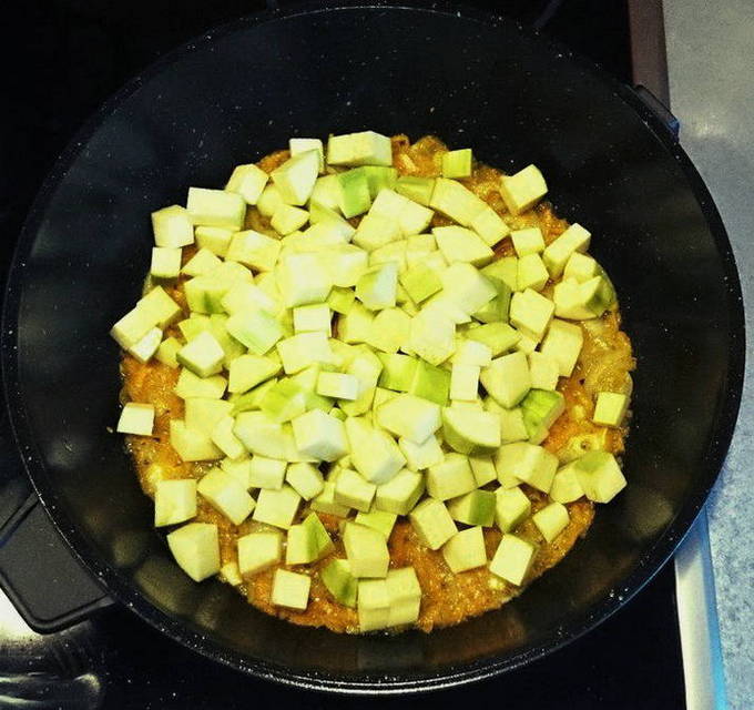 - Voeg courgette toe, in blokjes van dezelfde grootte gesneden, waarvan de schil, paprika en uien eerder zijn verwijderd.
