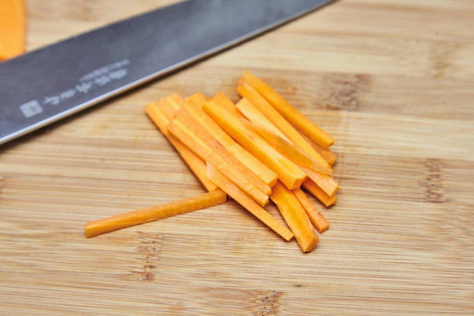 - Snijd de paprika in blokjes, rasp de wortelen fijn.