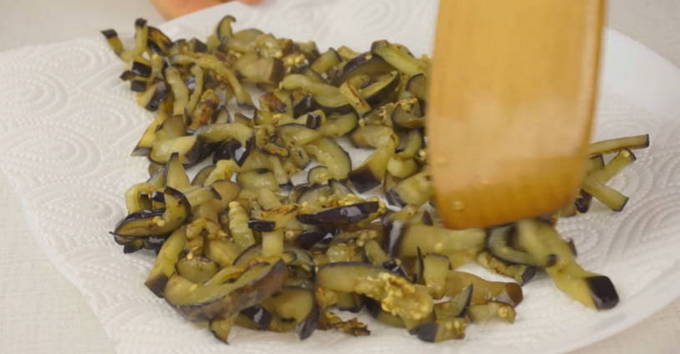 - Verwijder de schil van de aubergines, snijd ze in repen en bestrooi met zout, laat 15 minuten staan om de bitterheid te verwijderen en bak ze dan in kleine porties goudbruin en doe ze in een andere bak op papieren servetten om overtollig vet te verwijderen.