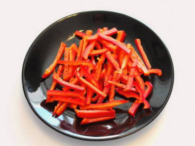 - Paprika's, beter dan verschillende kleuren, maar altijd felle kleuren, ontdoen van zaden en interne partities en snijden in halve ringen. Bak dan weer in olie, zoals dat gebeurde met aubergines en courgettes.