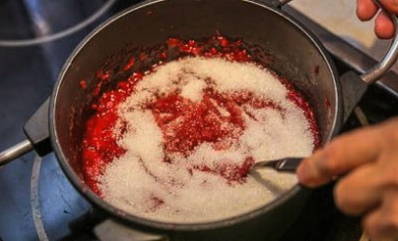 - We voegen suiker toe aan het bessenmengsel.Breng de massa aan de kook en kook tot het droge product volledig is opgelost.