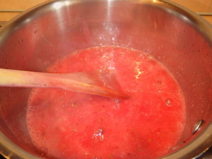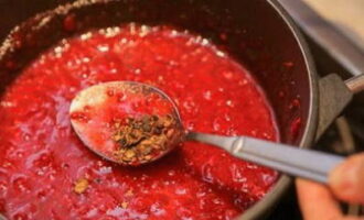 - We brengen de massa rode aalbessen en kruiden aan de kook en koken dan nog 15 minuten op laag vuur. Roer af en toe.