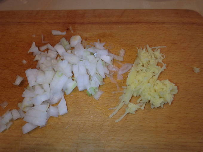 - Pel de sjalotten en hak ze fijn, en wrijf de gemberwortel op een fijne rasp.