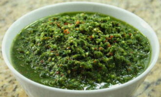 - We sturen het ingrediënt naar de blender samen met de gepelde knoflookteentjes en chilipepers. Het malen van de inhoud.