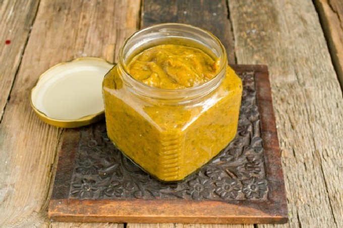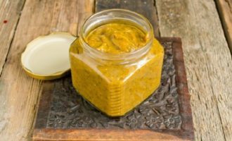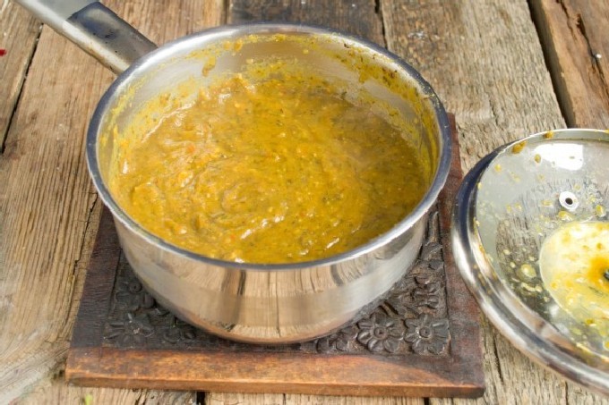 - Verdeel de saus, terwijl hij nog heet is, in steriele potten die van tevoren zijn klaargemaakt, schroef de deksels erop en dek af met een handdoek tot hij is afgekoeld. Bewaar de saus op een koele plaats.