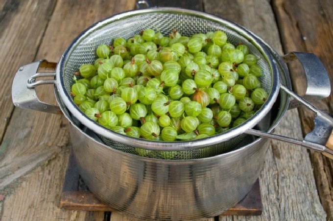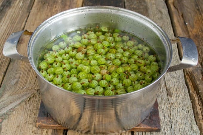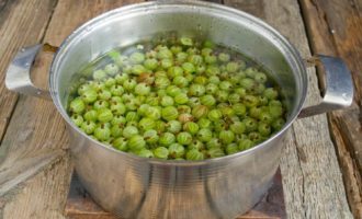 - Doe ze in een pan, vul ze met water en steek ze in brand.Als ze koken, zet u het vuur laag, dek af en stoom de kruisbessen gedurende 30 minuten.