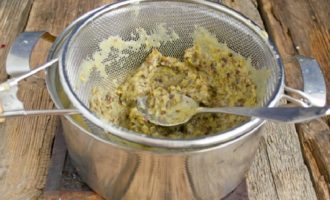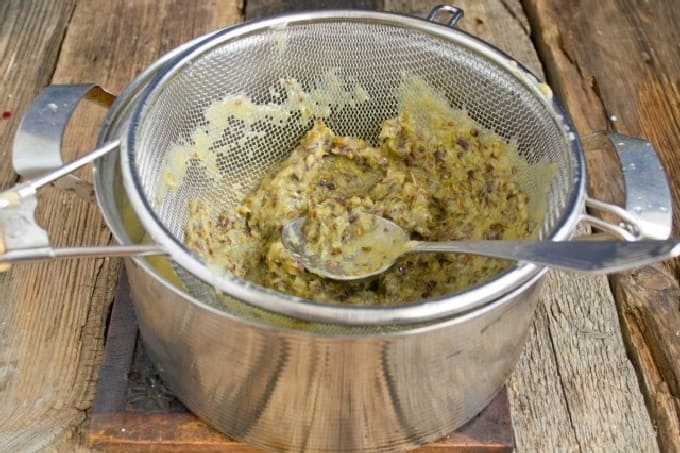 - Plaats een zeef op een pan en keer de zachte bessen erop om. Maal het op een handige manier, zodat je de zaden en de schil verwijdert en een homogeen vruchtvlees en sap krijgt.