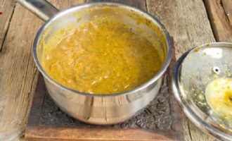 - Meng alle ingrediënten in een pan, voeg kristalsuiker, zout toe en als de massa dik is, voeg dan kruisbessenbouillon toe. Je zou de consistentie van vloeibare zure room moeten krijgen.