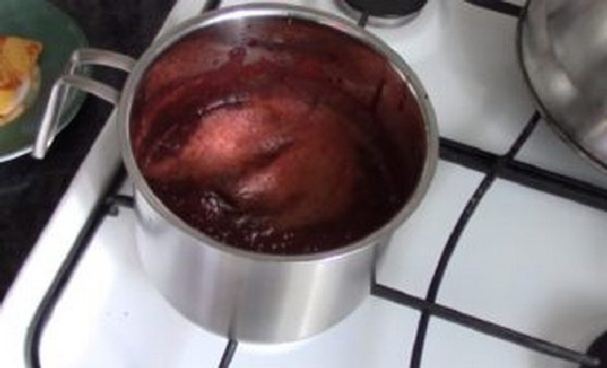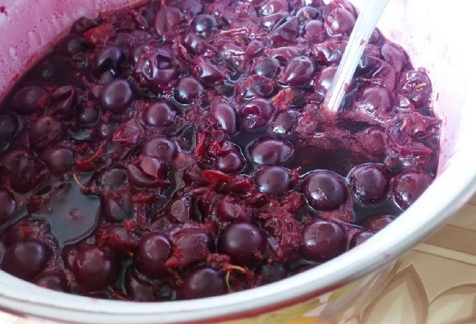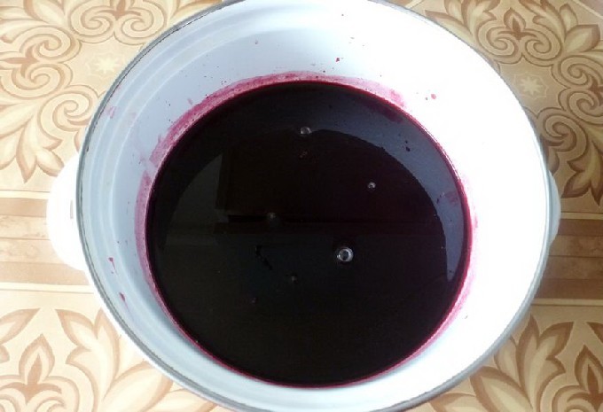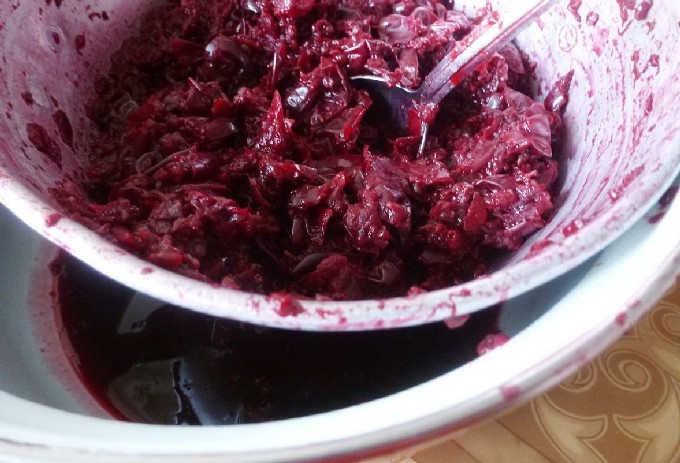 - Sorteer de bessen uit het afval, spoel ze af en plaats ze een tijdje in een vergiet. Breng de bessen over in een diepe kom, roer, dek af en zet op een laag vuur om ongeveer een uur langzaam te sudderen, zodat het sap opvalt, je hoeft geen water toe te voegen.