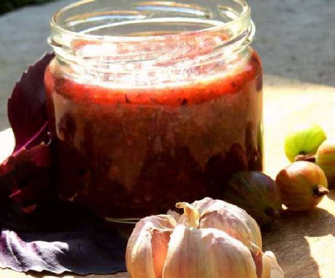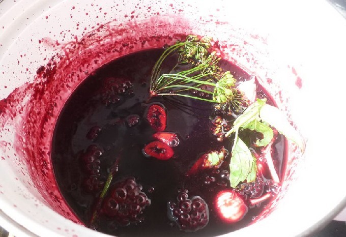 - Breng de massa bessen over in een pan en kook. Doe er zout, suiker, peper en gemalen steranijs in. Kook op laag vuur gedurende 10 minuten, af en toe roeren. Breng de knoflookpap over naar de basilicum en azijn en kook nog 3 minuten.