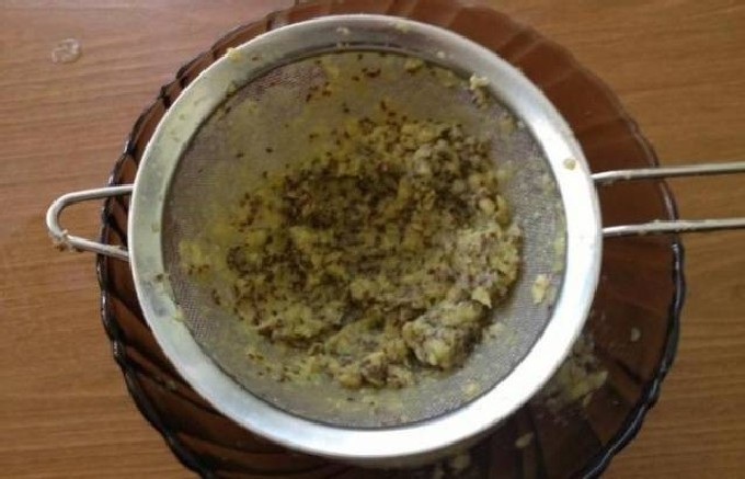 Wrijf de aardappelpuree door een zeef, en hoewel dit proces tijdrovend is - verwaarloos het niet, zodat de saus zacht, homogeen en zonder pitten en stukjes schil wordt.