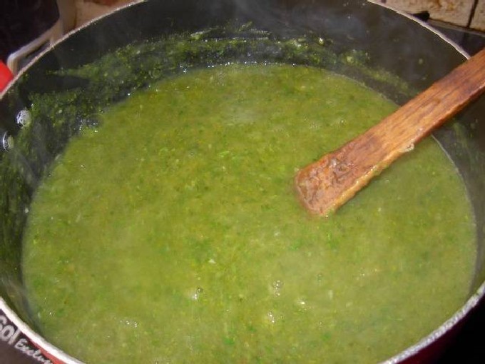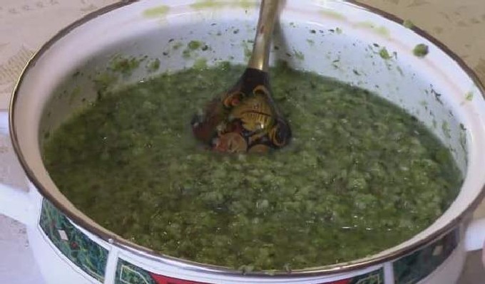 - Maal de bessen met een staafmixer tot een homogene consistentie. Zet de resulterende pap op het vuur, en zodra het kookt, voeg zout, 1/3 suiker, de helft van de suneli hop, peper, koriander toe, roer en proef na 5 minuten.