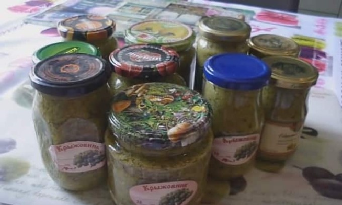 In voorgewassen en droge blikken, gedroogd in de oven, leg het werkstuk neer en steriliseer gedurende 15 minuten, sluit dan voorzichtig, draai om. Na afkoeling op een koele plaats bewaren.