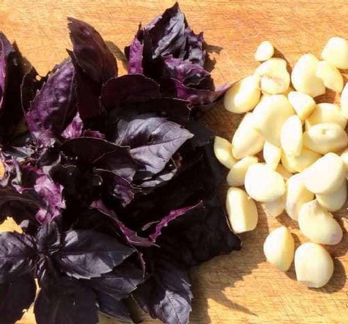 - Pel de knoflook. Snijd de basilicumtakken samen met de blaadjes in 4 stukken. Sorteer de kruisbessen en was ze.