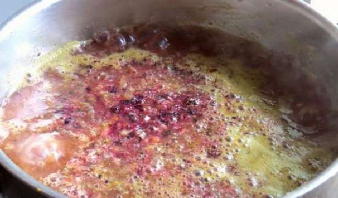 - Voeg bessen, zout en suiker (wit kan ook) toe aan de ui en kook, onder voortdurend roeren, 10 minuten. Doe rozijnen, curry en azijn op het werkstuk.Kook gedurende 10 minuten, tot de bessen volledig gaar zijn en het mengsel dik wordt. Probeer de saus en breng de smaak eventueel in evenwicht met suiker of zout. de zuurgraad van de bes is onmogelijk te voorspellen.