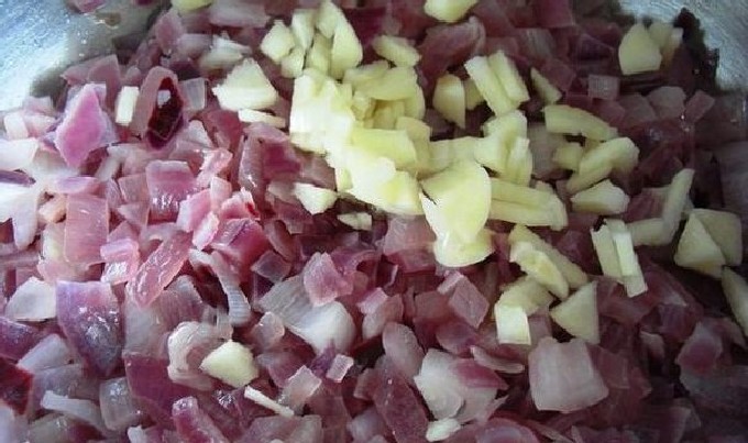- Pel de ui en 1 grote teen knoflook, snij in blokjes en laat 20 minuten sudderen in olie gemengd met water in een diepe kom. Uien mogen niet bruin worden. Voeg daarom, indien nodig, wat meer water toe en dek de borden af met een deksel.