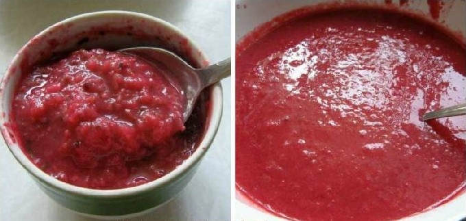 - De saus zal dik blijken te zijn met stukjes rijkgekleurde bessen. Je kunt een romige textuur maken met een blender of het zo laten. Giet het terwijl het nog heet is in steriele, droge potten en rol het op.