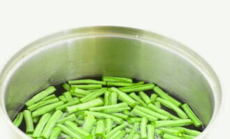 Was de aspergebonen, snijd de staarten aan beide kanten af en snijd de peulen in stukken van 2-2,5 centimeter lang. Kook water in een pan, doe de bonen erin en kook gedurende 10 minuten na het koken.