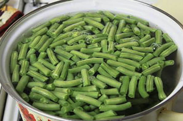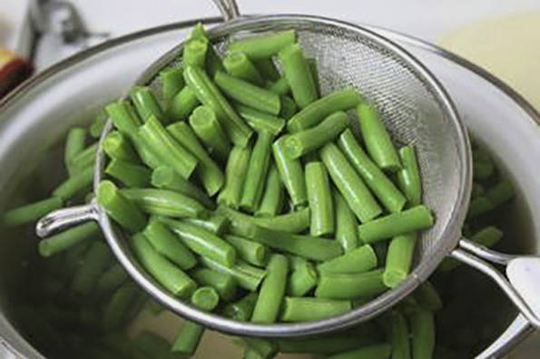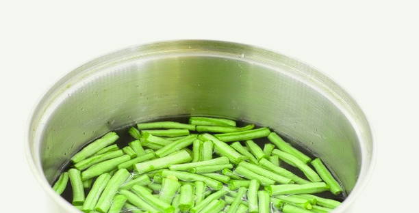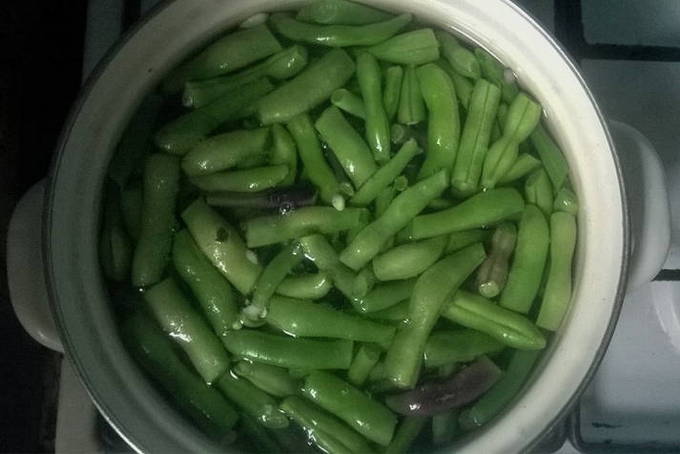 - Giet water in een pan, voeg een beetje zout toe en kook het. Dompel de bonen vervolgens in kokend water en kook ze 5 minuten. Gooi de gekookte bonen in een vergiet.