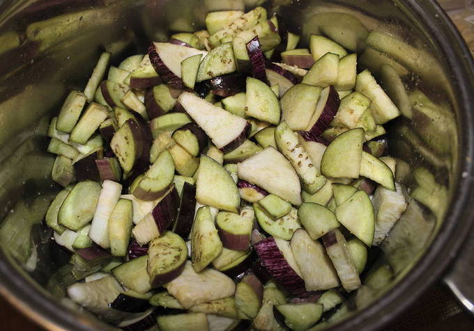 - Was de aubergines en snij in kleine blokjes. Zout de aubergines en laat een half uur staan, spoel daarna het zout af met water.