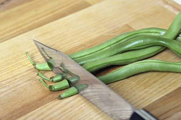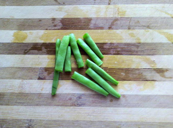 - Snijd de staarten van de peulen en snijd ze in 2-3 stukken.