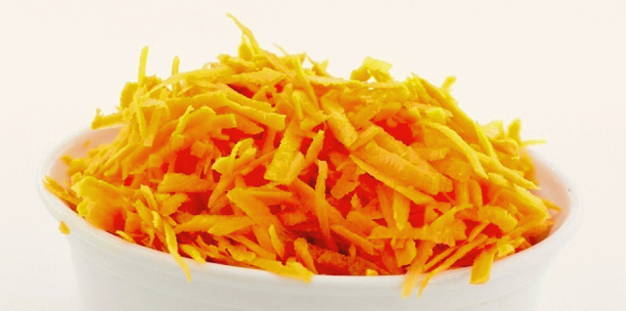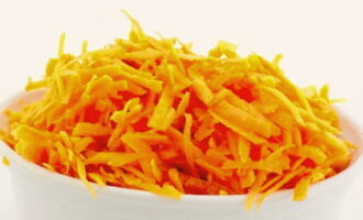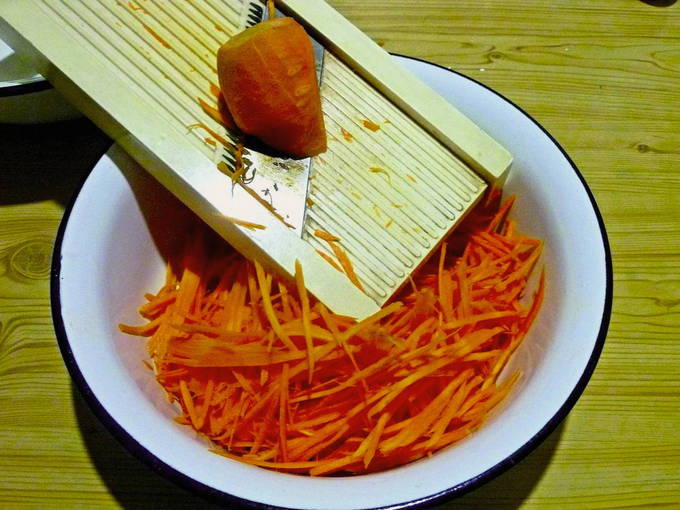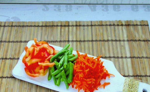 - Rasp de wortelen op een grove rasp, snijd de paprika in reepjes, snij de aspergebonen in reepjes van 2-3 centimeter.