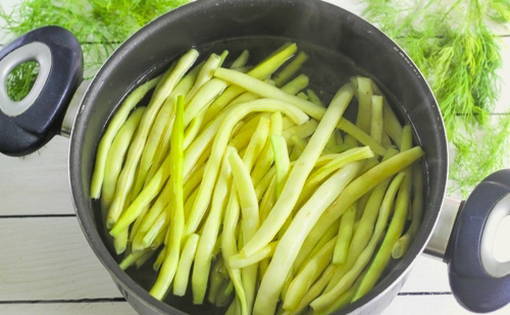 - Giet water in een pan, voeg citroenzuur toe en breng aan de kook. Leg de aspergebonen in kokend water en kook ze 2 minuten.