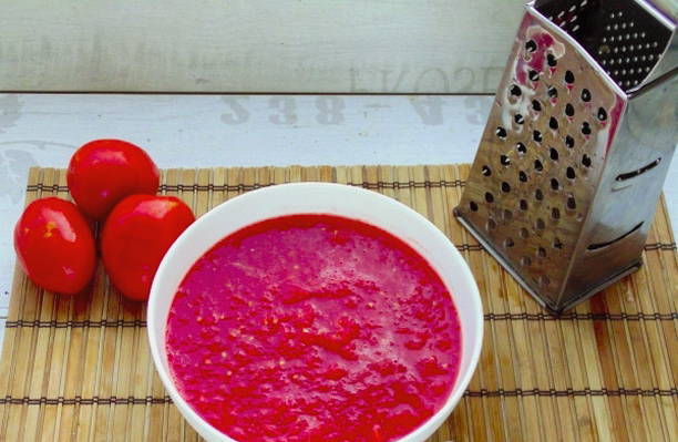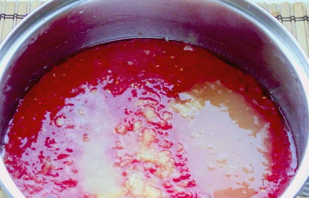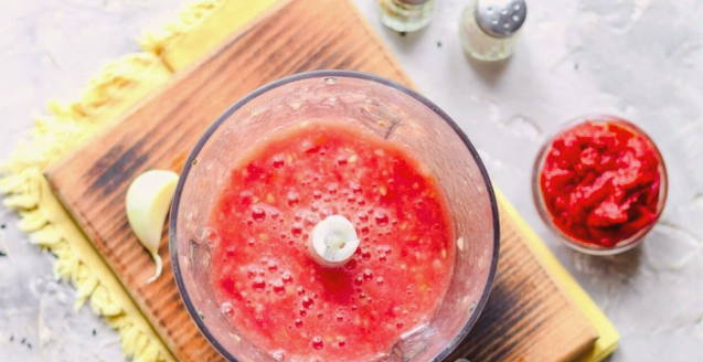 - Voeg plantaardige olie, gehakte knoflook, gemalen peper, suiker en zout toe aan de tomatenmassa. Breng de massa aan de kook en kook 5-7 minuten.