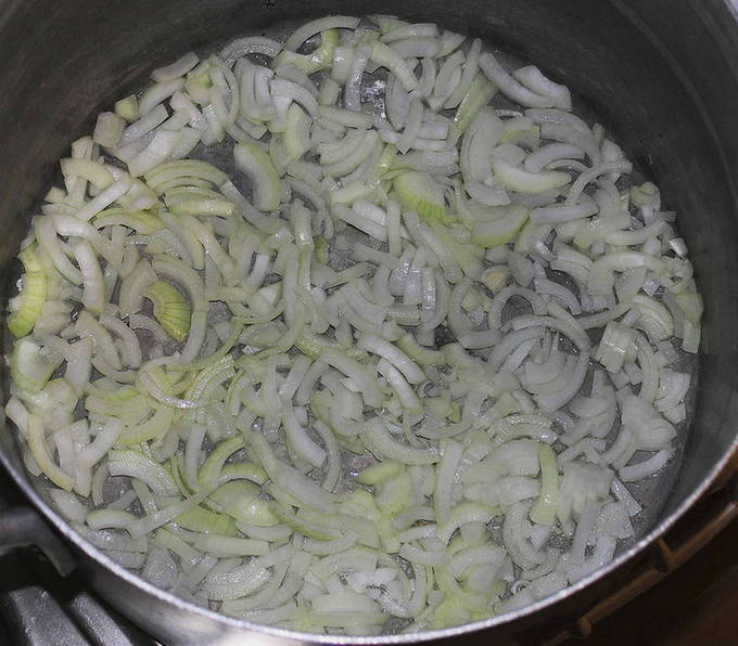 - Giet plantaardige olie in een pan, bak de uien erin tot ze transparant zijn.