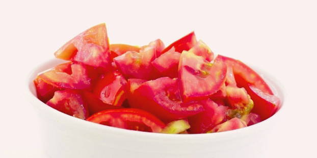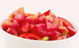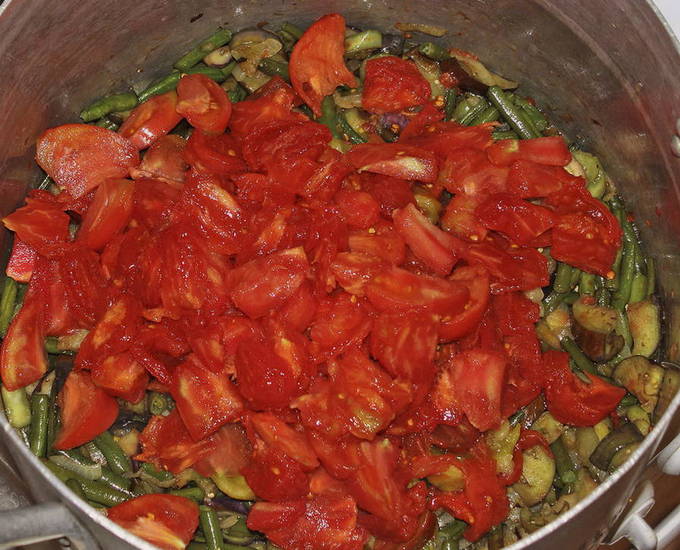 - Snijd de tomaten in blokjes en voeg ze toe aan de rest van de groenten. Voeg zout en suiker toe, laat de salade een half uur sudderen.