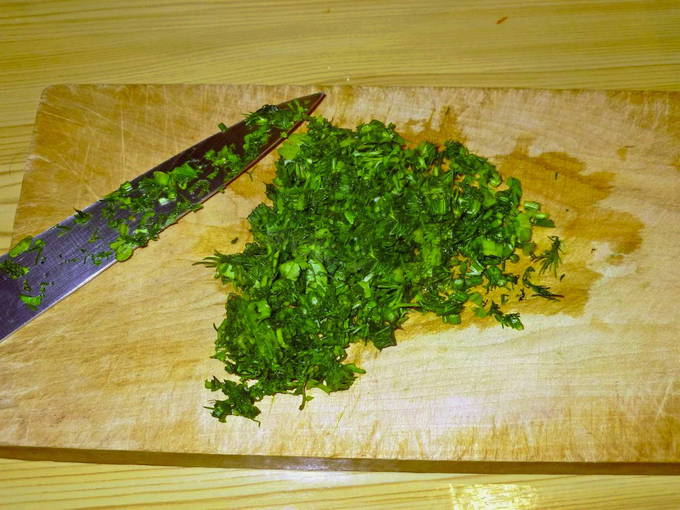 - Voeg vervolgens gehakte kruiden en knoflook toe aan de salade.