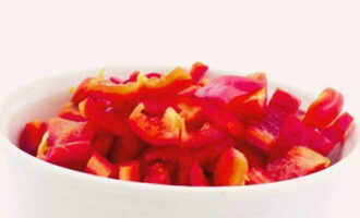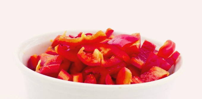Was de paprika's, schil de zaden en tussenschotten, snijd het vruchtvlees in reepjes.