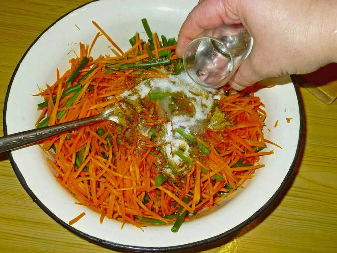 - Gooi de gekookte bonen in een vergiet om de vloeistof af te tappen. Voeg vervolgens wortels, kruiden, suiker, zout en azijn toe, meng.