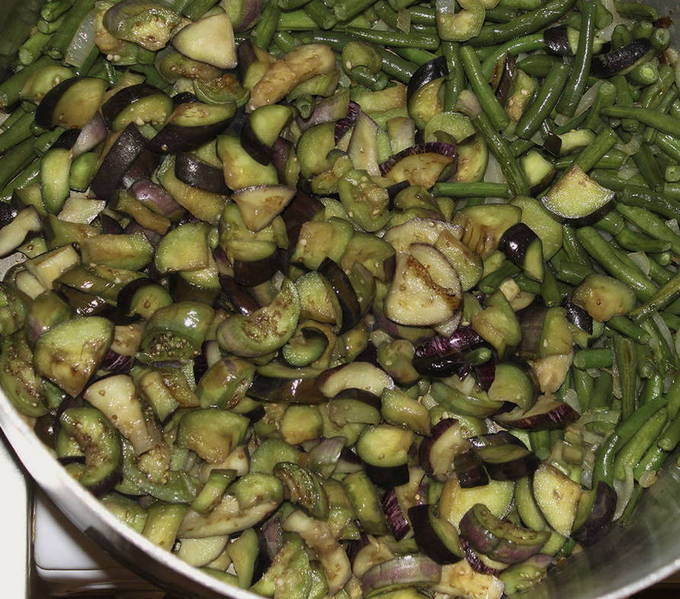 - Bak de aubergines 5 minuten apart in een koekenpan. Combineer de aubergine, ui en aspergebonen.
