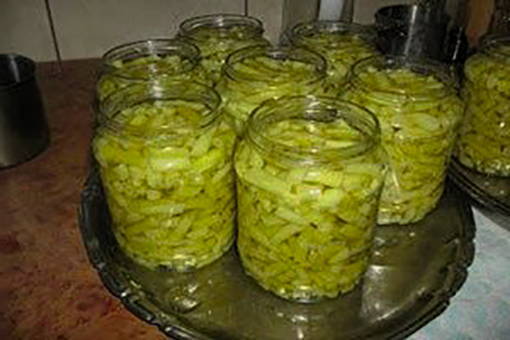 - Giet vervolgens de azijn erbij, meng en verdeel de salade in gesteriliseerde potten, rol ze op. Koel de saladerolletjes ondersteboven en bewaar op een koele plaats.