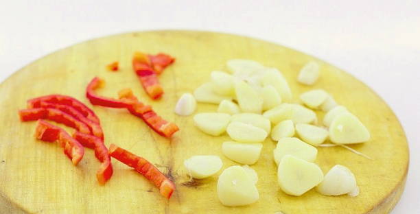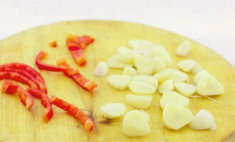Pel de knoflookteentjes en snij in plakjes. Snijd de hete peper in ringen.
