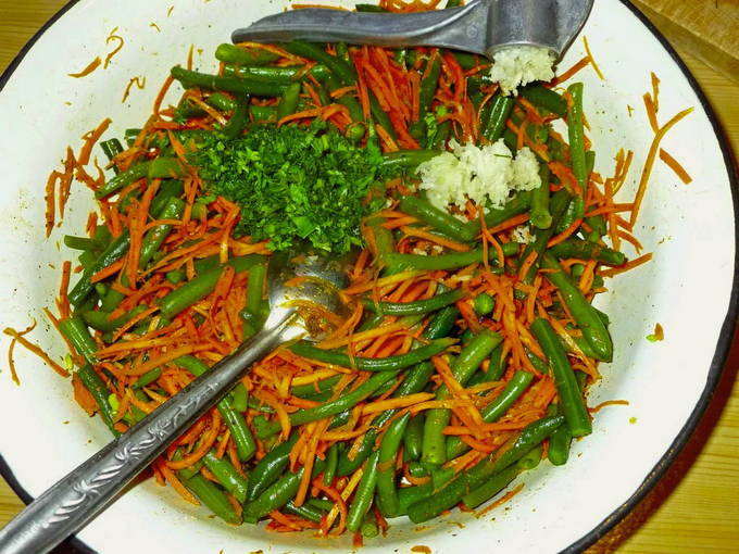 Heerlijk en pittig voorgerecht gemaakt van aspergebonen die niemand onverschillig laat. Deze salade past perfect bij vlees- en visgerechten. Voor een dergelijke bereiding moeten de bonenpeulen jong en dun zijn.