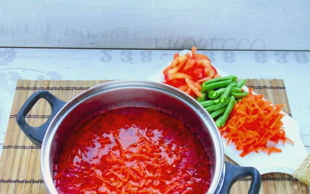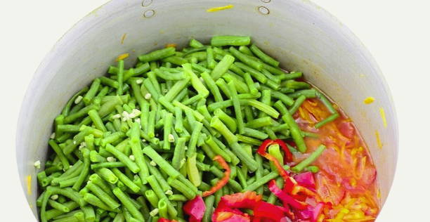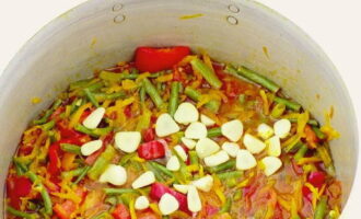 Voeg vervolgens zoete en hete pepers, aspergebonen toe aan de pan, roer en laat nog 10 minuten sudderen.