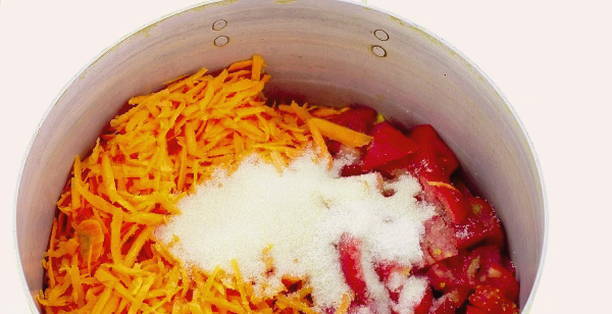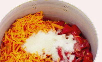 Giet plantaardige olie in een pan, verwarm het, doe tomaten en wortels, voeg suiker en zout toe, roer en laat 25 minuten onder een deksel sudderen.