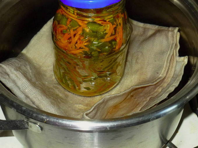 - Doe de salade in gesteriliseerde potten, dek af met deksels en doe in een pan. Giet water in een pan en steriliseer de werkstukken gedurende 20 minuten.