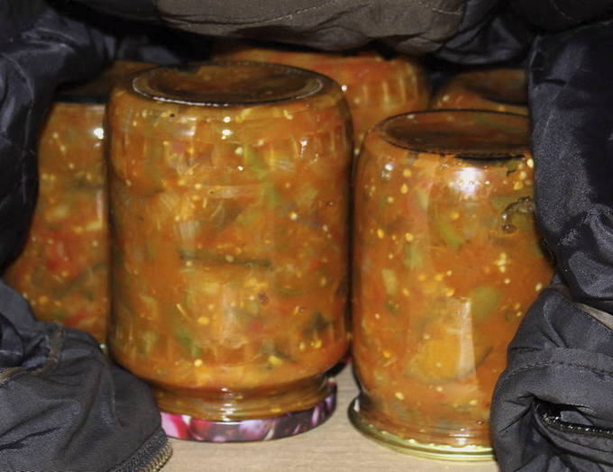 - Voeg aan het einde van het koken azijn toe, roer de salade en plaats deze in gesteriliseerde potten. Rol de salade op met schone deksels, koel af en wikkel hem op een koele plaats.
