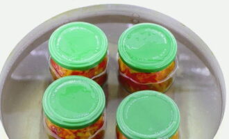 Verspreid de salade in gesteriliseerde potten, dek af met deksels. steriliseer de werkstukken in kokend water gedurende 15-20 minuten.
