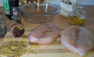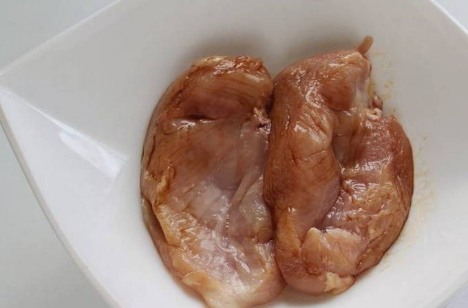 - Spoel de kalkoenfilet goed af. Veeg het product af met keukenpapier en leg het in een diep bord. Giet twee eetlepels plantaardige olie.