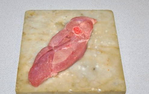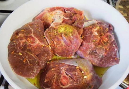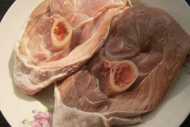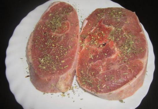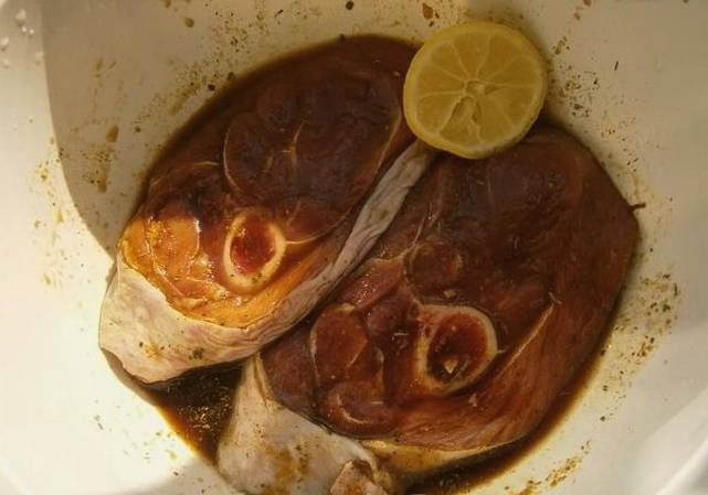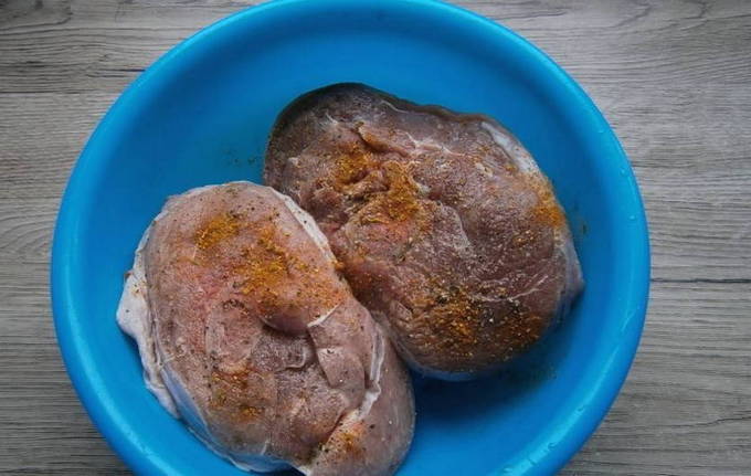 - Snijd de kalkoenpoot in dikke steaks. We wassen ze grondig.