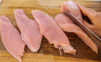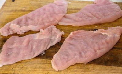 - Ontdooi de kalkoenfilet en verdeel deze in stapels van 1 cm.