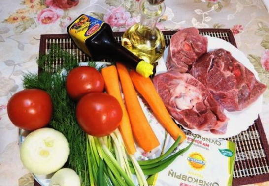 - Laten we de ingrediënten voorbereiden. We wassen groenten en kruiden onder water, ontdooien het vlees.